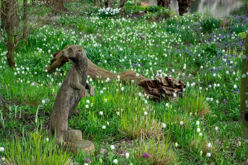 April – Fritillaria meleagris take over the show. Hundreds of purple and white flowers transform the Iris bed into a magical meadow. Anemone pavonina turn a grass bank in the front garden into a sea of colour. Tulips are popping in the pot display and around the garden.
