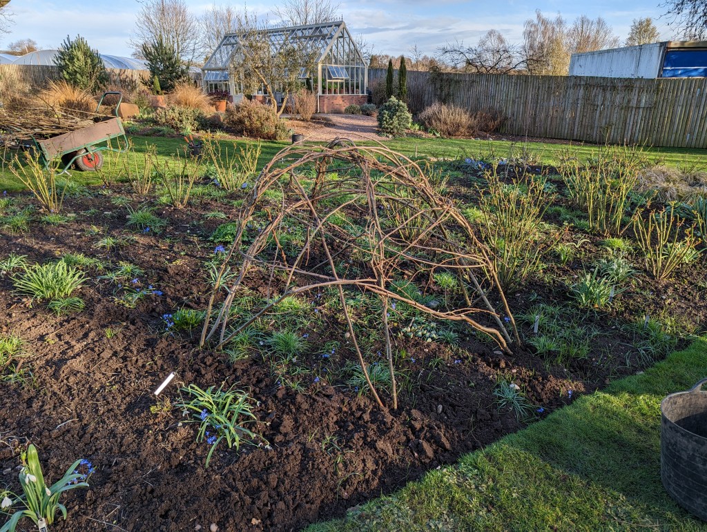 Now is a good time to be thinking about plant supports for the year ahead. Nigel showed me how to create supports using Hazel branches, once weaved together it’s amazing how strong these are. These will be perfect supports for the Solidago in Adams Garden.