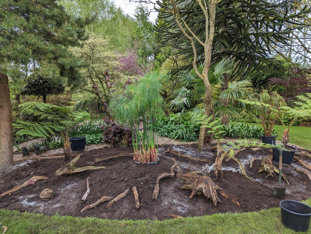 The Christopher Lloyd bed is one which is planted with tender plants and its design is different every year. This was one of my favourite jobs as I love working with tropical planting. The first thing that needed doing was the winter bedding needed stripping, this was comprised of Polyanthus and Tulips. Once this had been removed Nigel began to think about the layout of the bed and how the levels were going to work. Islands were created by mounding up the soil, wood stumps and branches were used to hold it back. Channels were dug between these to give the effect of a river flowing through the bed.