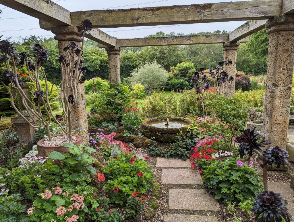 The urn in the front garden was planted with a selection of different fuchsias. The last pots I planted were two matching sets in the Mediterranean garden, I got to choose what went in these! For the smaller pots I selected Agave ‘Mediopicta Alba’ with Echeveria surrounding and the large pots Aeoniums with Aloe dawei, Echeveria and Curio repens.